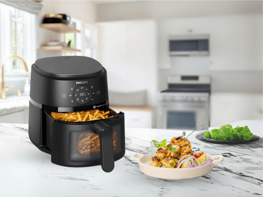 Built with unique RapidAir technology, the Philips NA210/09 Air Fryer uses little to no added oil to deliver a crispy texture outside while keeping the inside tender. With its see-through glass, you can easily monitor your food as it cooks to perfection. Enjoy healthier, delicious meals while saving time and energy with the Philips NA210/09 Air Fryer.